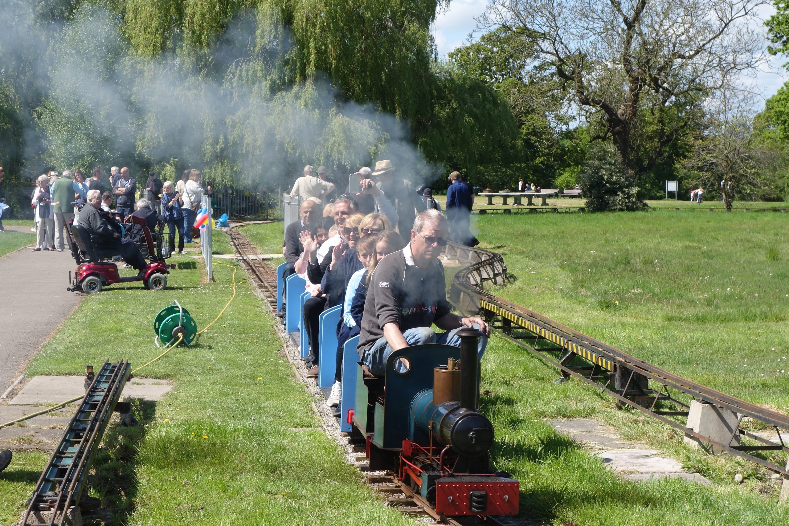 The society has laid a ground level 7¼” track and raised 3½” and 5″ tracks in Meriton Road Park.
